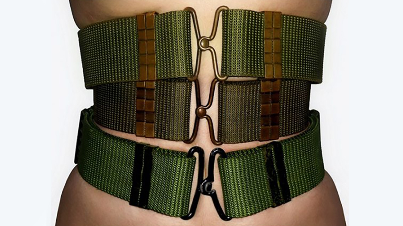 Precisamente, Khadis de la Rosa entabla un diálogo entre esos dos picos supuestamente ajenos y opuestos uno del otro: la fémina y lo militar. Y no solo pone en evidencia, a la mera interpretación del receptor, la ambivalencia que por tiempo ha existido sobre la mujer y el entorno militar, la puesta en duda de su sexualidad y feminismo, su supuesta debilidad física principalmente en comparación con el hombre militar. Hay en sus piezas un evidente cuestionamiento sobre la indumentaria, los principios a seguir incondicionalmente una vez que formas parte de tal sistema. Y todo ello, a su vez, lo proyecta en franca alusión a prácticas sexuales y sociales que encorvan al sujeto en un estado perenne de sumisión. Por ejemplo el zambrán, cual corsé fetiche que siluetea la figura femenina (Corset, 2011), o como látigo que provoca el dolor-placer de los juegos eróticos (Alianza, 2015), o los casquillos de balas (Sabbat, 2015), dispuestos conscientemente en puntos activos, que reafirman el carácter incisivo sobre el cuerpo femenino “buscando re-direccionar el flujo vital del mismo”.[1]