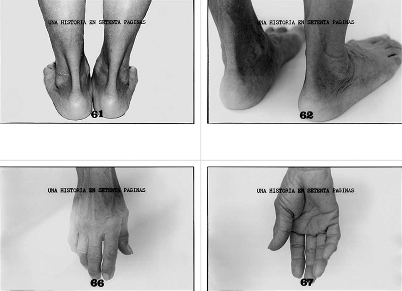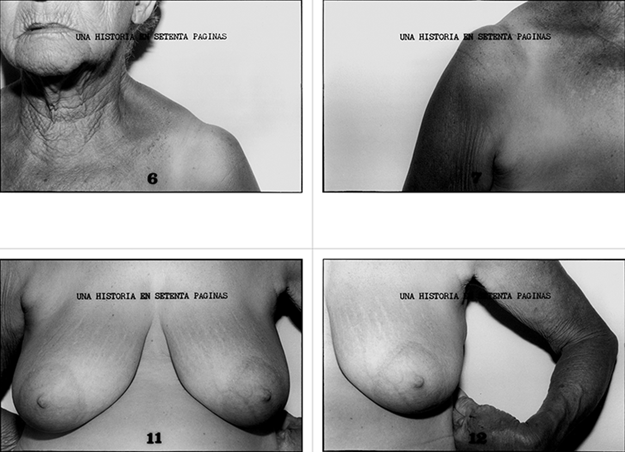 DECLARACIÓN DE PROYECTO. A History in 70 Pages anuncia un giro en la obra de Consuelo Castañeda. El motivo del mosaico fotográfico fue una circunstancia personal: la madre de Consuelo (…) arribaba a los 70 años (…) La imagen de Castañeda se sumaba así a las escasas aproximaciones artísticas sobre la senectud o la tercera edad, y constituía un hecho excepcional frente a sus contemporáneos (…) Desechó los recursos expresivos del claroscuro, los medios tonos, la relación entre fondo y figura (…) y asumió un enfoque objetivista más afín a la nueva fotografía alemana de Bernd y Hilla Becker, Candida Höfer y Thomas Struth. Carente de toda pose, el desnudo de la anciana no se ofrece íntegro a la mirada del espectador, sino que ha sido fragmentado en los setenta cuadros, cada uno correspondiente a un año de vida, que componen el ensamblaje…